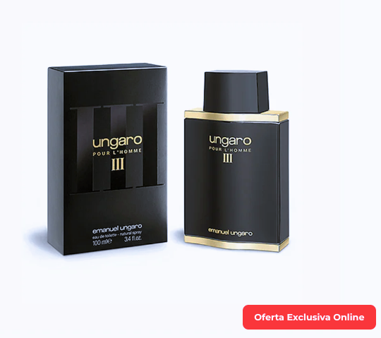Ungaro III EDT 100 ML es una fragancia de la familia olfativa Aromática Verde para Hombres. Las Notas de Salida son naranja, caoba, cilantro, lavanda, vodka, salvia y limón (lima ácida); las Notas de Corazón son jazmín, lirio de los valles (muguete), rosa y geranio; las Notas de Fondo son sándalo, pachulí, almizcle, musgo de roble, vetiver y cedro.